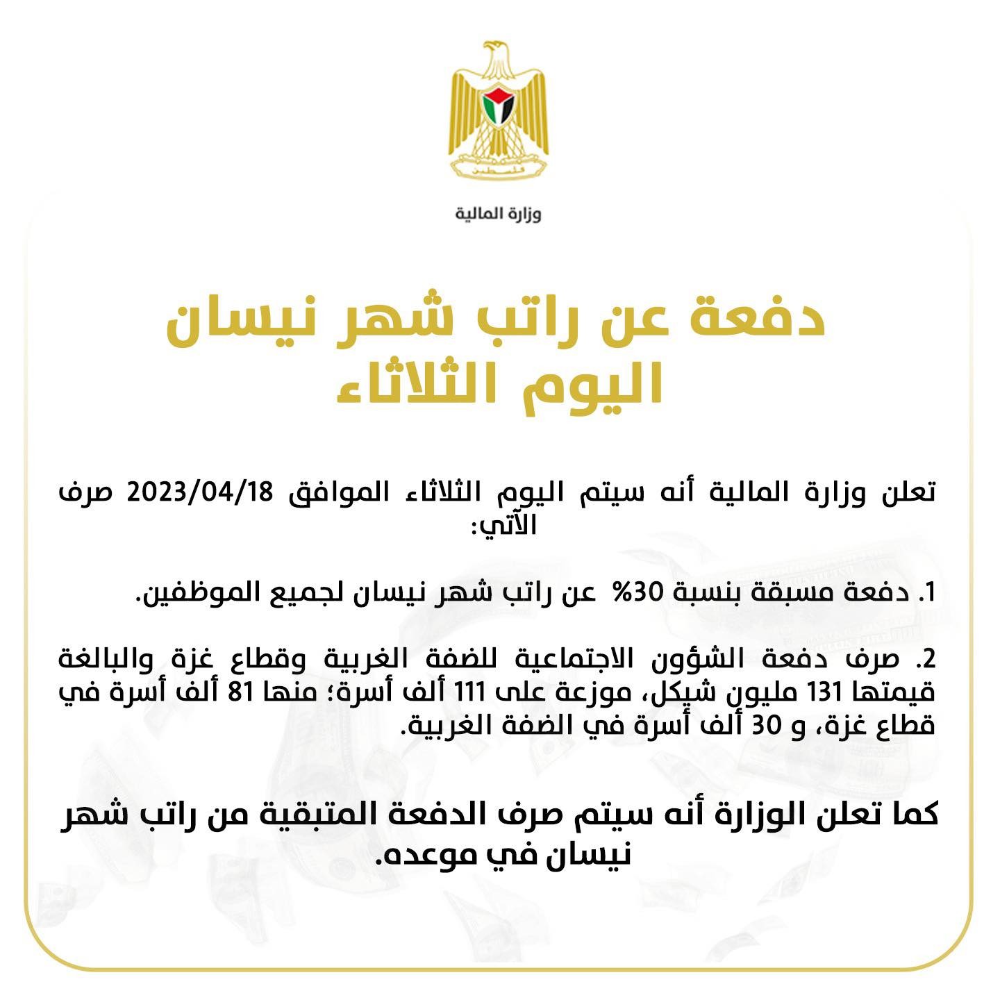 الثلاثاء 18 أبريل, 2023أعلنت وزارة المالية الفلسطينية، اليوم الثلاثاء، البدء بصرف دفعة مسبقة بنسبة 30% عن راتب شهر نيسان لجميع الموظفين، وكذلك صرف دفعة الشؤون الاجتماعية للضفة الغربية وقطاع غزة .